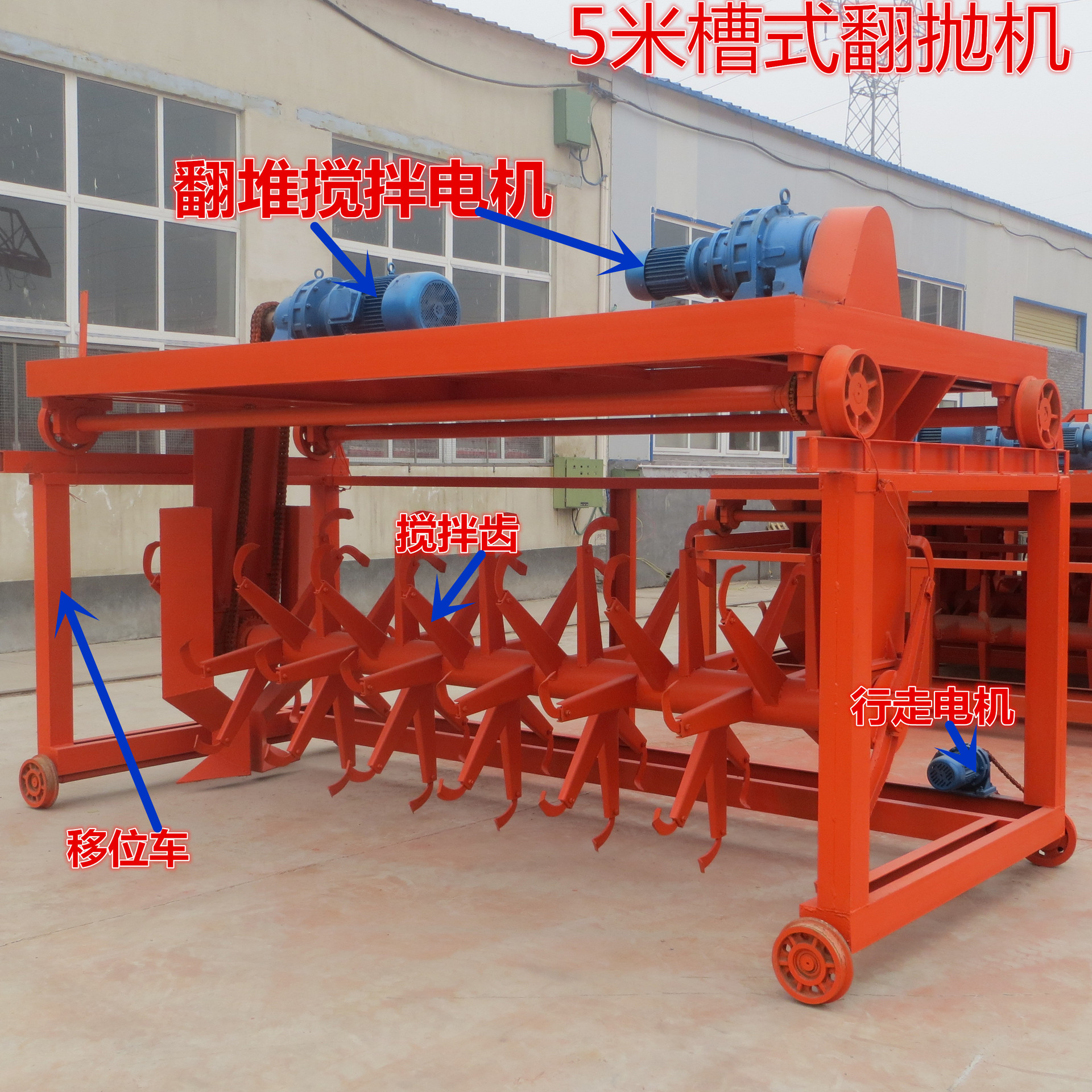 槽式翻拋機由傳動裝置、行走裝置、翻堆裝置、轉移車等主要部件組成。電動機直接將動力傳給減速器經(jīng)鏈輪至翻堆滾筒,滾筒上的攪拌槳葉呈螺旋分布,可將發(fā)酵槽內(nèi)的物料翻轉攪拌,起到翻堆速度快、攪拌均勻的效果,從而達到物料與空氣的充分接觸,使物料的發(fā)酵效果更好。