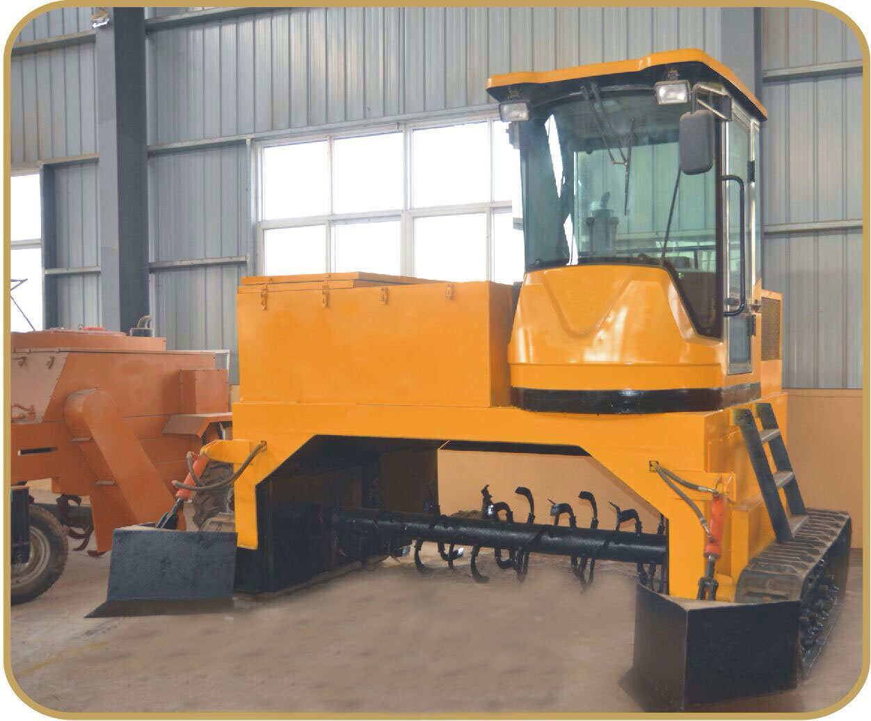 該履帶式翻拋機(jī)采取四輪行走設(shè)計(jì),可前進(jìn)、倒退、轉(zhuǎn)彎,由一人操控駕駛。行駛中整車騎跨在予先堆置的長(zhǎng)條形肥基上,由機(jī)架下掛裝的旋轉(zhuǎn)刀軸對(duì)肥基原料實(shí)施翻拌、蓬松、移堆,車過(guò)之后篆成新的條形垛堆。該履帶式翻拋機(jī)即可在開(kāi)闊室外露天場(chǎng)地,也可在車間大棚中實(shí)施作業(yè)。